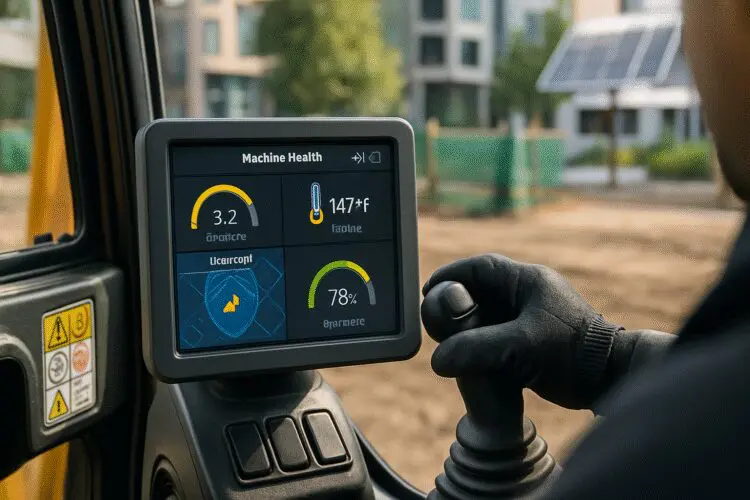 Alt text: Digital monitor displays machine health parameters in the construction vehicle cockpit.
